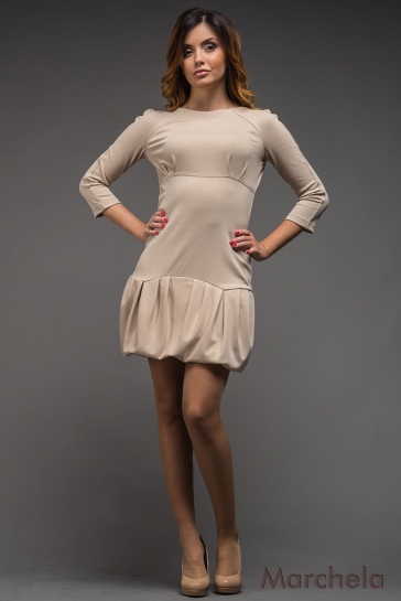 Трикотажное платье с двухслойной короткой юбкой со складами. Сзади круглый вырез, застежка на пуговку и потайная молния. Ткань: «француз-нейлон». Длина изделия: 82 см.