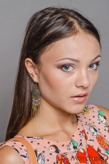 Оригинальные серьги в этническом стиле украшены разноцветными бусинами.