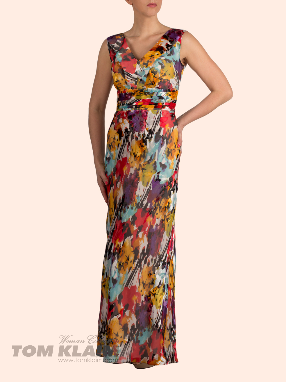 Длинное платье в пол из травленого шелка "Деворе" с ярким цветочным принтом. Имеет V-образный вырез и широкий, заложенный в складки, пояс.