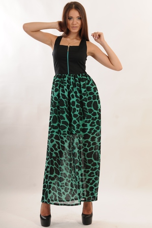 Стильное платье макси-длины с отрезным лифом по талии. Верх выполнен из стрейч-коттона черного цвета с застежкой на яркую змейку, юбка присборенная по талии выполнена из шифона "windy" с леопардовым принтом. Сзади потайная змейка, и подъюбник из черного шифона.