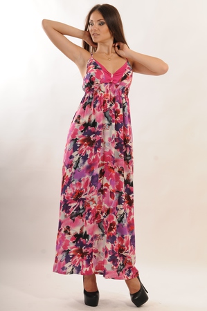 Легкий летний сарафан макси-длины свободного кроя от груди, на тонких бретелях. Модный цветочный принт цвета фуксии, на груди вставка из однотонной ткани, отделка рядом мелких резинок по всей окружности сарафана создает дополнительную поддержку и идеальную посадку.