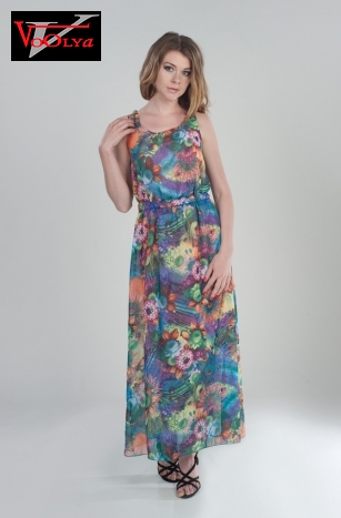 Элегантное летнее платье в пол с ярким цветочным рисунком.На талии резинка, которая придает легкости и воздушности. Модель с овальной горловиной и открытой спиной.
