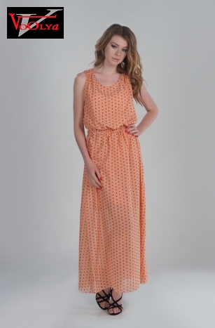 Изысканное летнее платье в горошек. На талии резинка, которая придает легкости и воздушности. Модель с овальной горловиной, а на спинке завязка на бант.