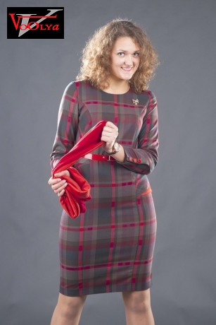 Очень изысканное платье в красную клетку. Модель с длинными рукавами и округлым вырезом горловины. По низу рукавов пришиты контрастные 3 пуговицы. Дополняет образ металлическая "золотистая" брошь.