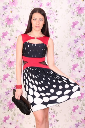 Красивое платье без рукавов с округлым вырезом горловины украшенной пряжкой. Необычный вырез на лифе платья и по бокам изделия. Модель декорированна секрой и контрастной отделкой. Платье серии 0608 удовлетворит запросы любой модницы.