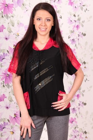 Эта великолепная блузка очень оригинально и эффектно смотрится благодаря своему интересному дизайну. Изделие с короткими рукавами декорировано гипюровыми карманами и капюшоном.