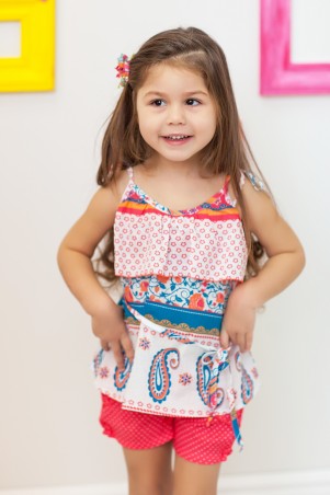 Дополнительно: верху на завязках, на талии поясок, расклешенный к низу.