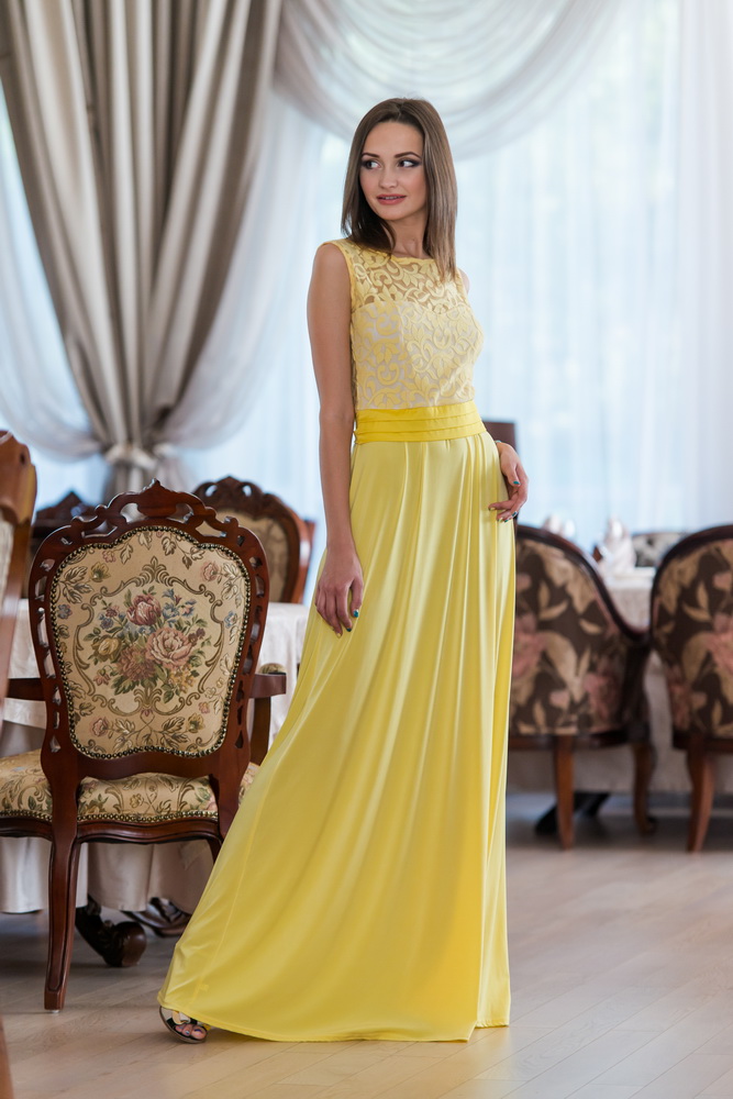 Красивое комбинированное платье. Плечи и спинка полупрозрачны, выполнены из сетки-флок. Юбка расширяется к низу, без разреза. На талии закрепленный пояс, завязывается на пояснице бантиком