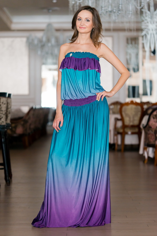 Оригинальное платье без бретель. Верх платья и на талии прострочен ниткой-резинкой для плотного прилегания. Верх чуть с напуском. Над грудью линия рюшей и маленькое украшение – брошка. Юбка расширяется к низу для удобства шага, без разреза.