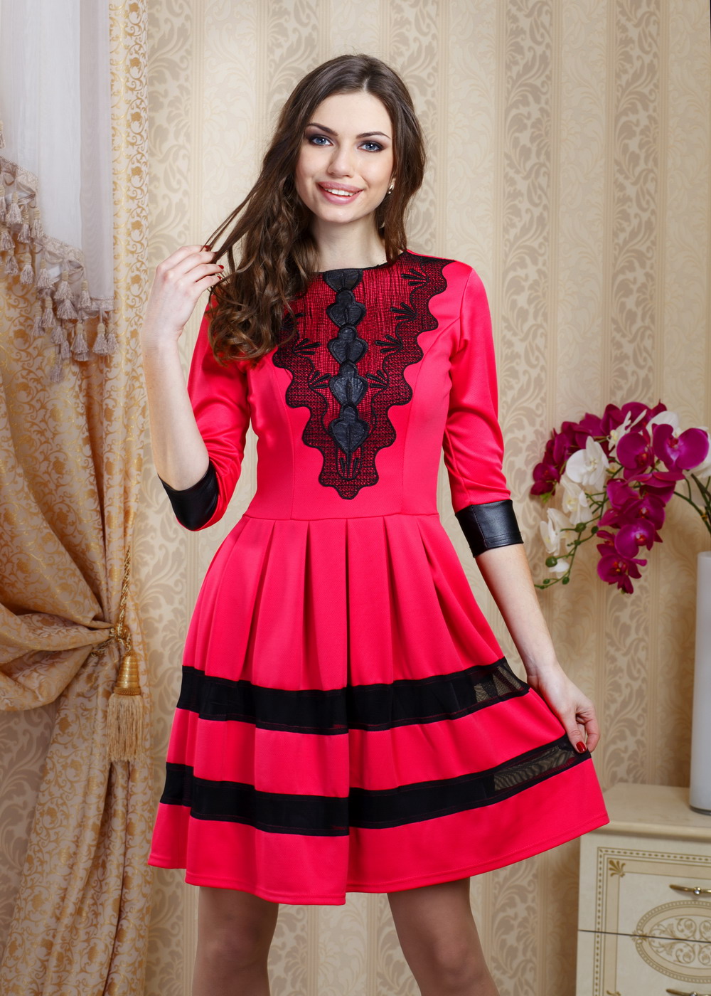 Яркое повседневное платье из крэпа. Юбка в складку украшена вставками из сетки. Передняя часть платья декорирована аппликацией, сзади украшением служит змейка. Рукав 3/4 с кожаной окантовкой.