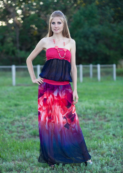 Летнее платье из шифона, на груди и симметрично на спине стянуто резинкой, верх чуть с припуском. Пояс изящно подчеркивает талию. Яркий принт цветов на юбке. Идет в комплекте с бусами.