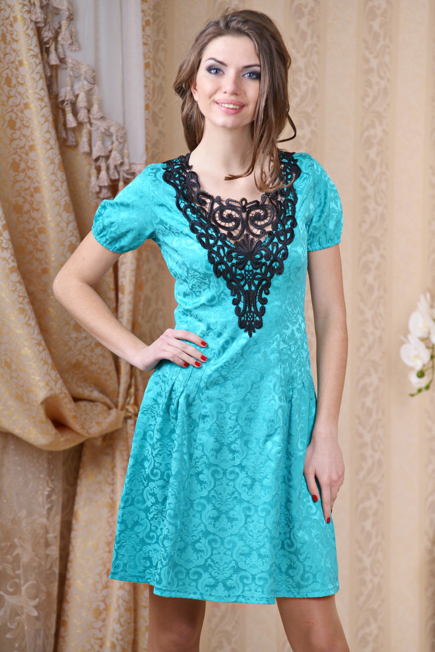 Стильное платье из жаккарда, выполненное в множестве цветов. Передняя часть украшена кружевной аппликацией. Оригинальные симметричные выточки спереди и сзади подчеркивают женский силуэт и придают юбке красивую форму.
