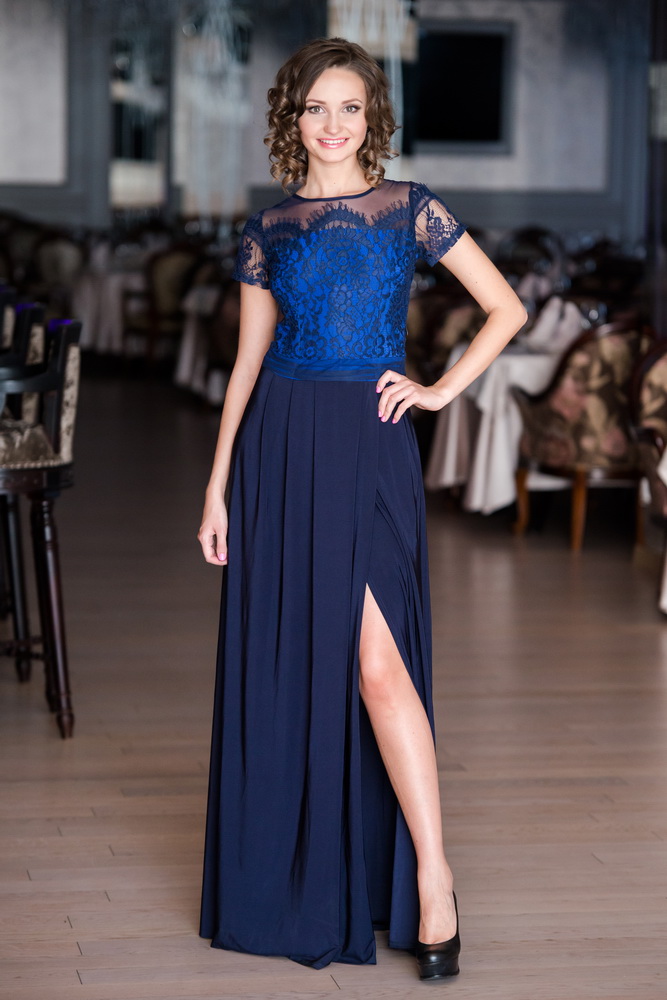 Вечернее платье. Полупрозрачные плечи, рукава и верх оригинально сочетаются с основной тканью платья. Линия талии подчеркивается встроченным пояском. Спереди по всей длине юбки разрез, который идёт внахлёст одним полотном. На спинке для удобства одевания платья есть застёжка-капелька с пуговичкой