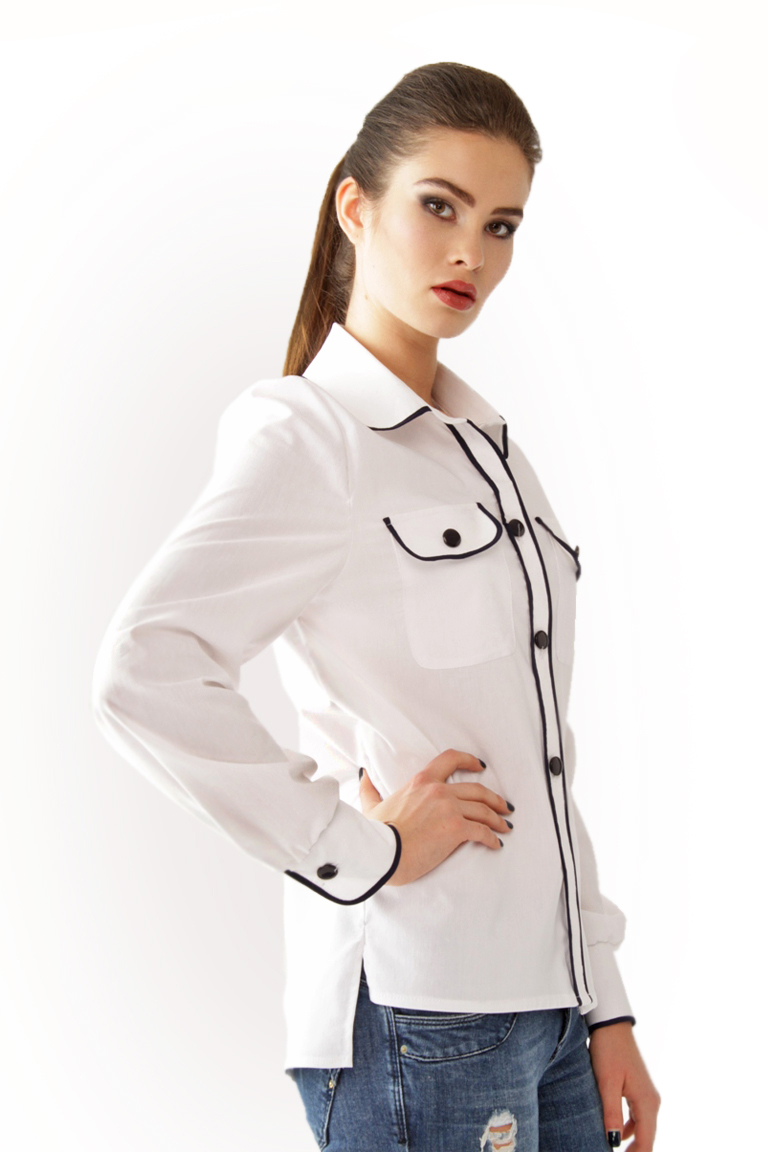 Оригинальная рубашка с контрастными кантами и пуговицами,на передней части накладные карманы,рукав с облегающей манжетой, передняя и задняя части асимметричны.