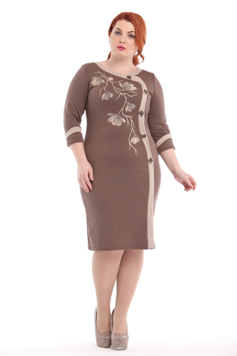Облегающее платье с асимметричной застёжкой - обманкой на декоративных пуговицах, рукав 3/4 с отворотом.Ткань: французский трикотажРисунок- печать методом накатаДлина платья:46,48 р-95 см, 50,52 р-100 см
