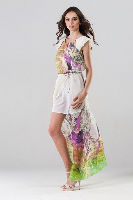 Очень интересное и эффектное повседневное летнее платье. Невесомый тончайший шифон свободно струится до самого пола. Свободная верхняя часть с запахом благодаря складкам и бижутерии образует оригинальный фигурный вырез. Юбка имеет высокий разрез сбоку, приоткрывающий короткую трикотажную подкладку. Сзади на спине также имеется вырез. Такое удобное, воздушное и неординарное платье обязательно найдет отклик у ваших прекрасных клиенток.