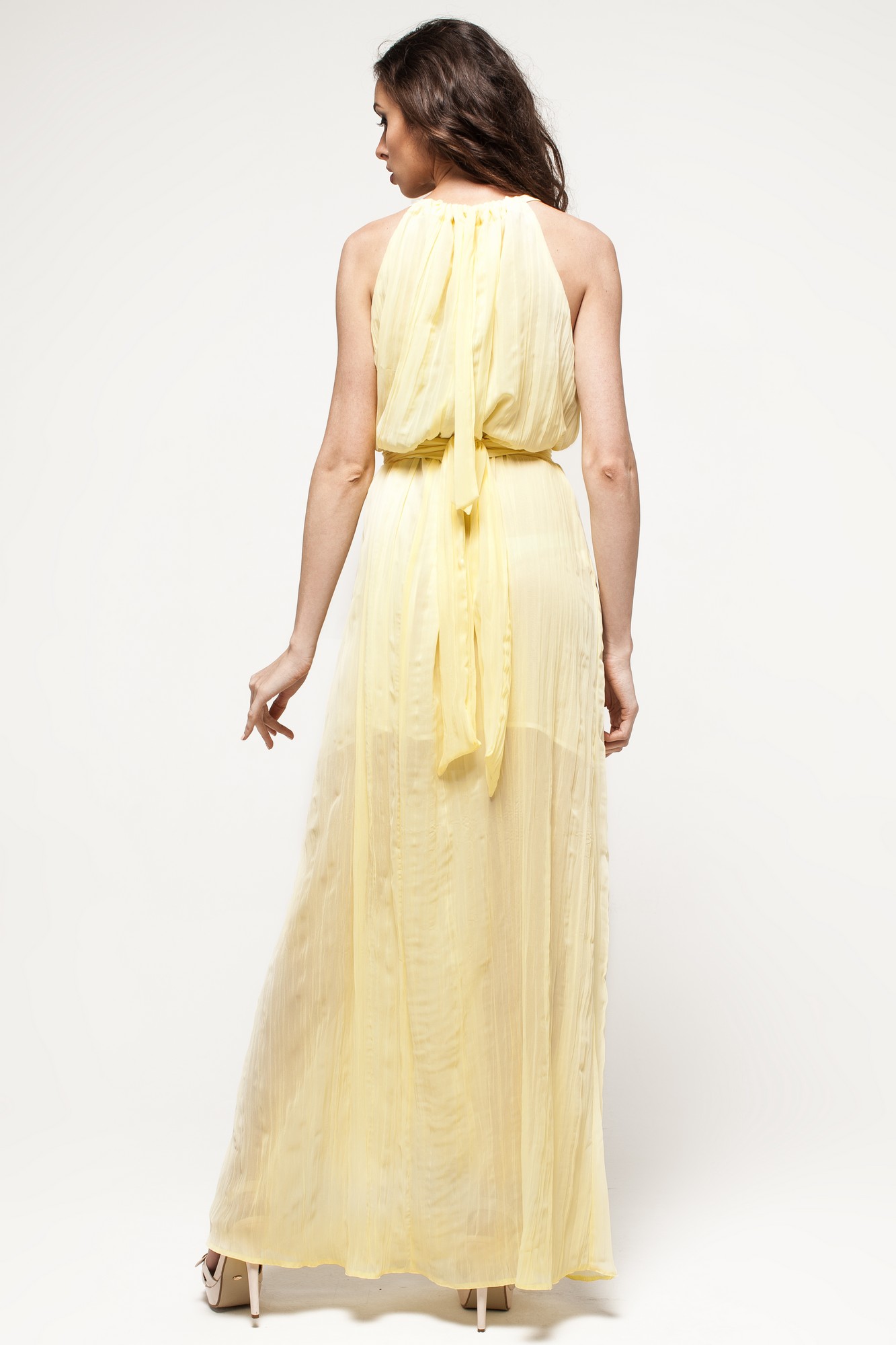 Восхитительное платье в греческом стиле внесет разнообразие в ваш ассортимент. Такой фасон пользуется небывалой популярностью уже несколько сезонов подряд. Модель имеет длину до пола и ровный крой. При помощи съемного тканевого пояса можно придать платью желаемую форму: обозначить талию, закрепить на бедрах или под грудью. Горловина украшена симпатичным декором из стразов. Платье на спине регулируется шнурком. Модель выполнена из легчайшего шифона, очень комфортного для носки в жаркую погоду.