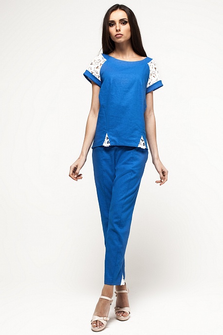 Брючный костюм из льна. Брюки прямые, зауженные книзу длиной 7/8. Понизу в боковых швах отделка шитьем. Пояс на резинке, боковой карман. Верх блузы свободного силуэта. Рукав реглан отделан шитьем, вырез горловины округлый. Декор по низу шитьем в разрезах.