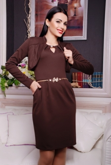 Платье женское, молодёжное, полуприлегающего силуэта, рукав прямой короткий. Выполнено из немнущегося трикотажа. Неглубокий вырез горловины оформлен небольшими защипами и декорирован пряжкой под золото. В комплекте идёт болеро, с длинным прямым рукавом, воротником стойкой. Длина изделия 90 см. Рост модели на фото 170 см. Пояс в стоимость не входит, цена100 грн.