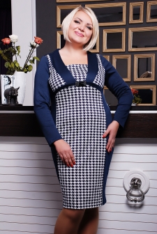 Платье женское, батальное, прилегающего силуэта. Платье с фигурным вырезом на горловине. По полочке и спинке заложены фигурные рельефы. На полочке платья вшит фигурный пояс, под грудью задекорированный брошью. В платье вставлена отделочная ткань "гусиная лапка". Рукав длинный.