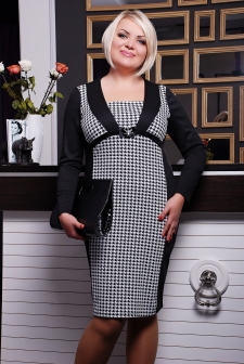 Платье женское, батальное, прилегающего силуэта. Платье с фигурным вырезом на горловине. По полочке и спинке заложены фигурные рельефы. На полочке платья вшит фигурный пояс, под грудью задекорированный брошью. В платье вставлена отделочная ткань "гусиная лапка". Рукав длинный.