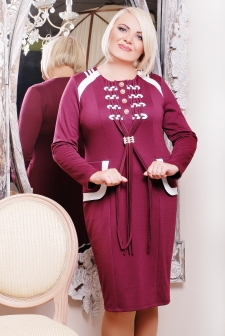 Платье женское, батальное, прилегающего прямого силуэта. По переду и спинке платья заложены фигурные рельефы. Платье с длинным рукавом. На полочки платья вшиты фигурные клапаны с отделочной ткани. Платье декорировано планкой, в которую вшиты "белые домики", через которые продета "вермишель".