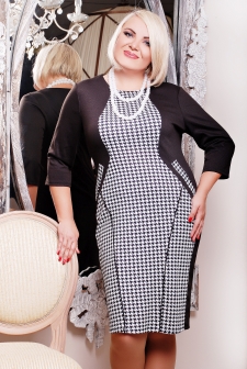 Платье женское, батальное, прилегающего прямого силуэта. Платье с круглым вырезом по горловине. По полочке и спинке заложены фигурные рельефы. На полочки платье вставлена отделочная ткань "гусиная лапка". Юбка полочки декорирована кантом из основной ткани и карманами "листочка" из отделочной ткани. Рукав 3/4.