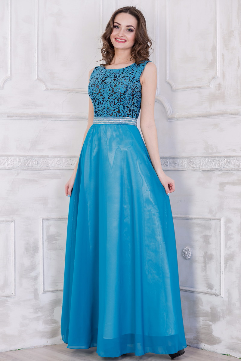 Шикарное вечернее платье с широко расклешенной юбкой к низу. Верх платья выполнен из сетки-флок. Полочка украшена стразами врассыпную. Юбка с атласной подкладкой. Линия талии подчеркнута атласным поясом с камнями. Длина: 150 см.