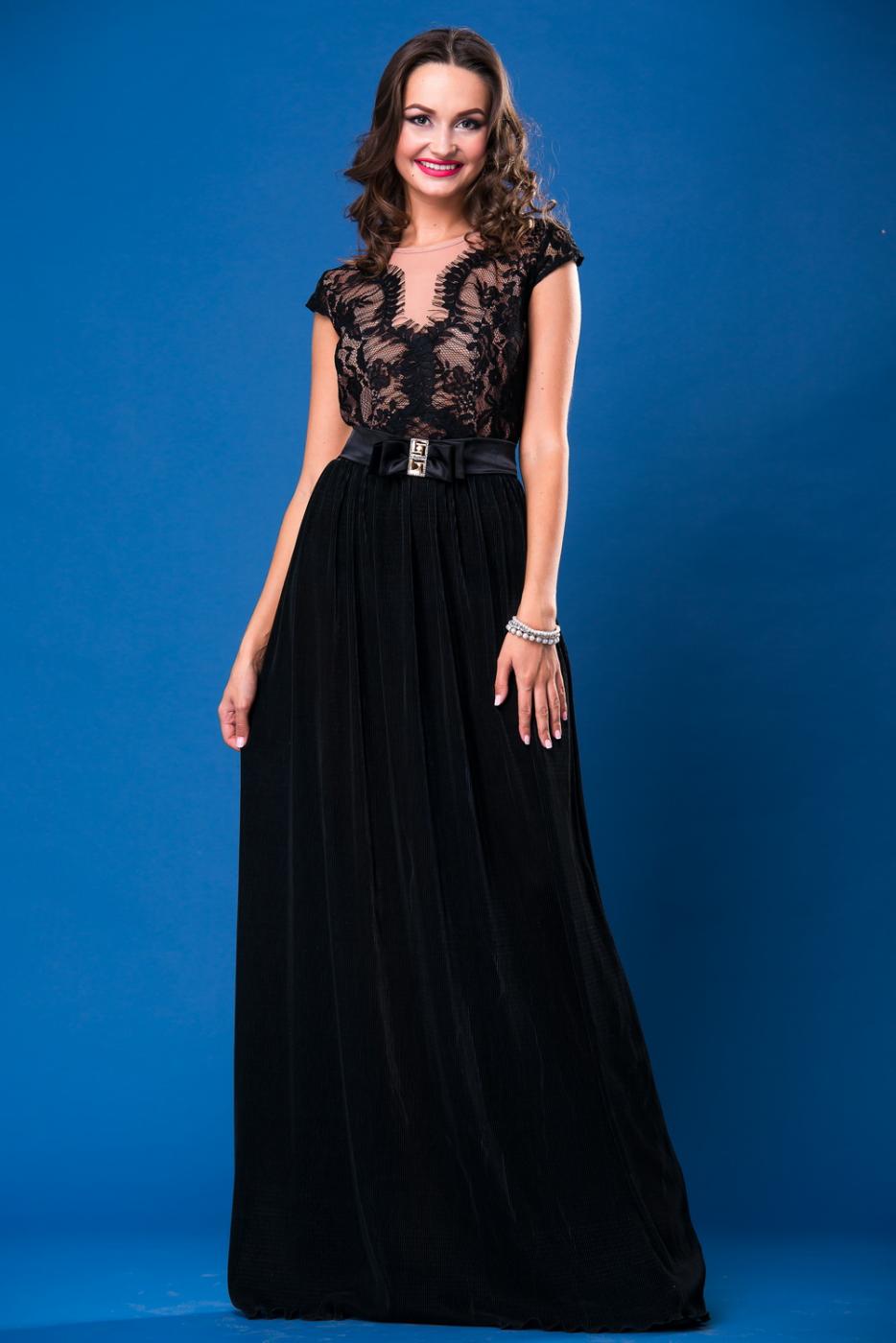 Черное вечернее платье придаст Вашему образу таинственности и очарования. Лиф выполнен из малострейчевого полупрозрачного гипюра на подкладке из сетки телесного цвета. На полочке V-образная форма декольте с ажурным кружевным краем смотрится очень женственно. Маленькие рукавчики зрительно сужают плечи. Длинная черная юбка из гофре-спички с вертикальным рубчиком, а также слегка завышенная атласным поясом линия талии визуально удлиняет ноги. Спереди заложен декоративный бант украшенный камнями.