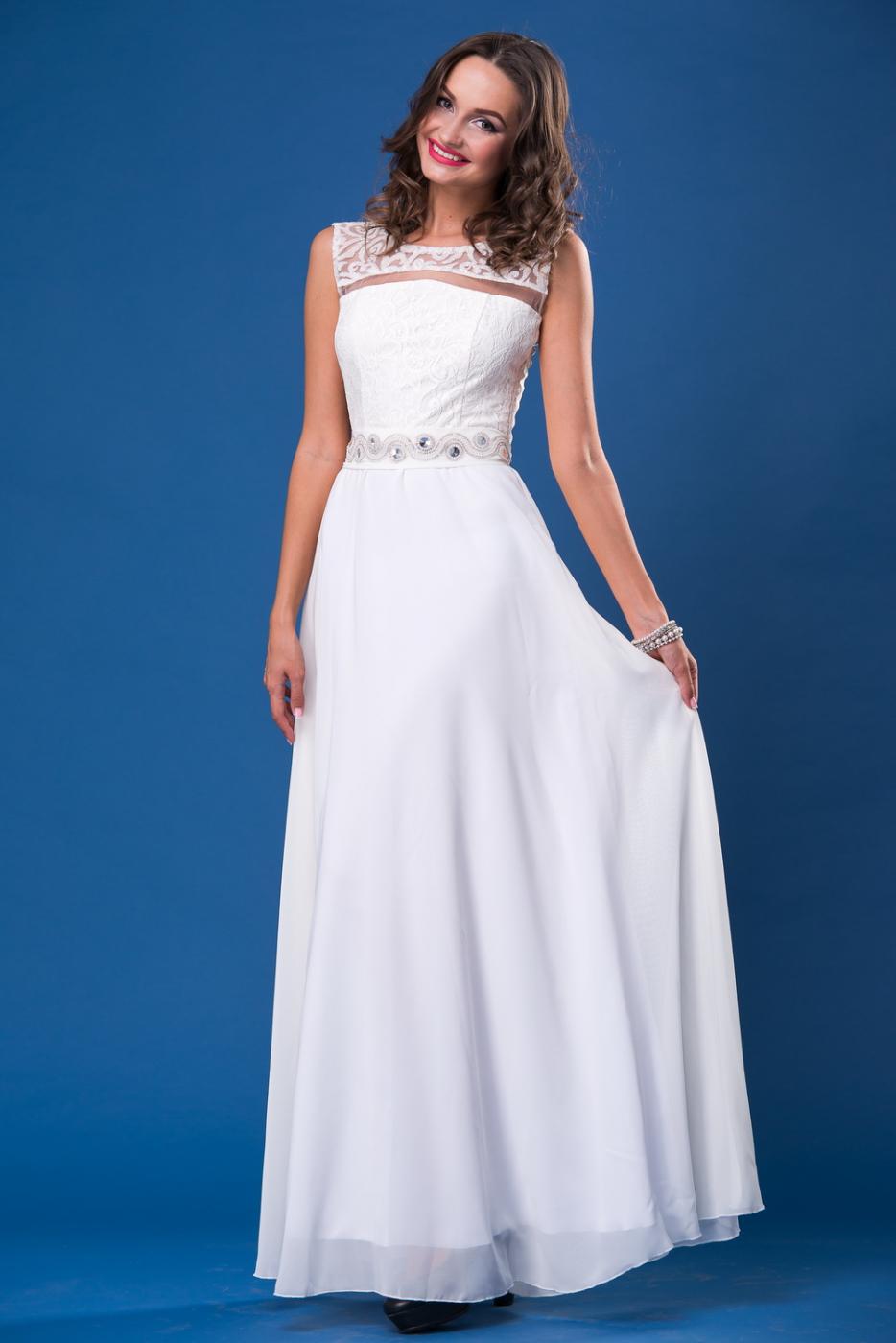 Нарядное платье длиной "в пол". Оригинальная декорация верха. Юбка из воздушного шифона сделает Вашу походку легкой и летящей. Пояс расшит камнями.