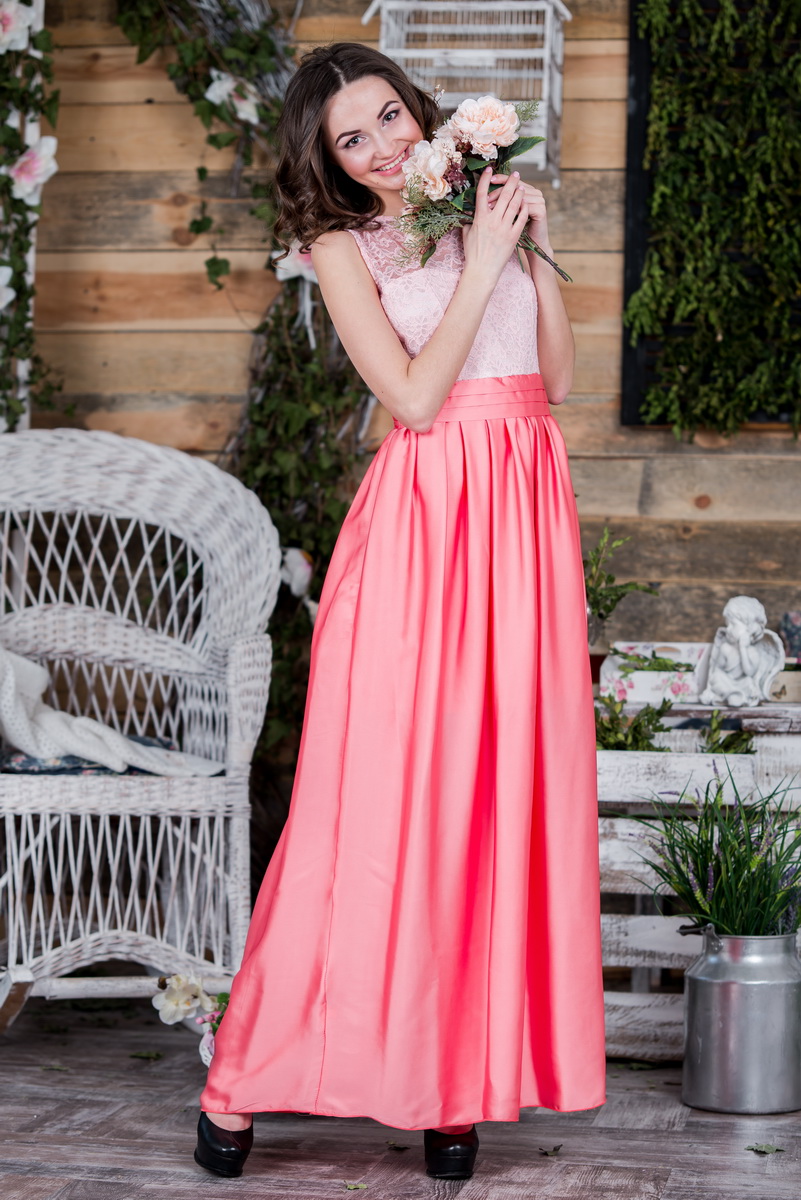 Длинное платье с юбкой из атлас-шифона. Гипюровый вверх придаёт загадочности образу. За шеей тонкие ленты-завязки, которые позволяют идеально отрегулировать посадку платья спереди по линии груди и сзади по спинке. Пояс подчеркивает талию и завязывается на пояснице. На спине глубокий вырез с ажурными боками.