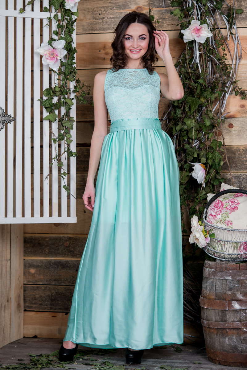 Длинное платье с юбкой из атлас-шифона. Гипюровый вверх придаёт загадочности образу. За шеей тонкие ленты-завязки, которые позволяют идеально отрегулировать посадку платья спереди по линии груди и сзади по спинке. Пояс подчеркивает талию и завязывается на пояснице. На спине глубокий вырез с ажурными боками.