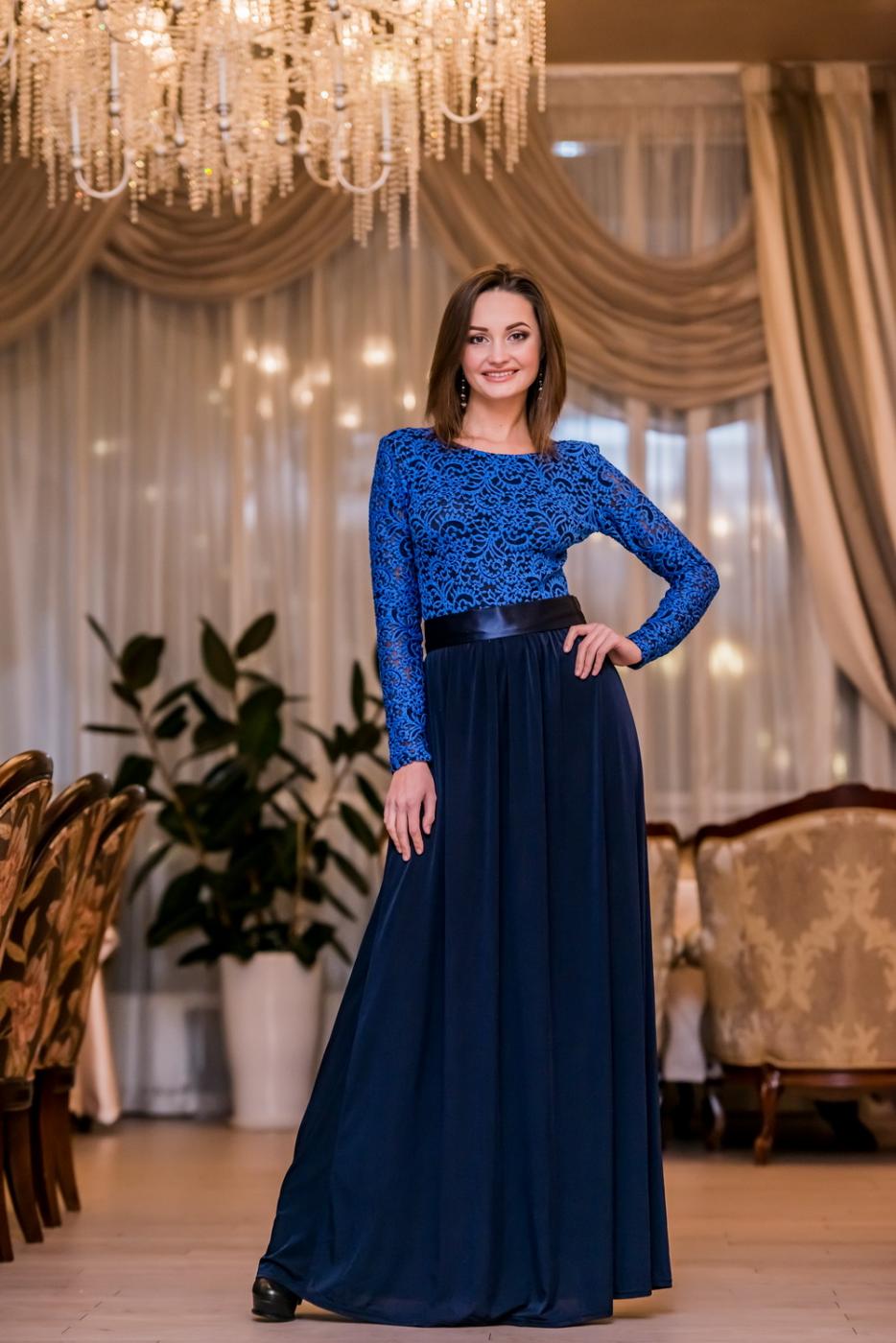 Элегантное вечернее платье с длинным рукавом. Богатый цветочный гипюр two-ton благодаря своим стрейчевым способностям идеально облегает фигуру. Изящное V-образное декольте подчеркнутое ажурным краем открывает женственные лопатки и показывает изящные изгибы хребта. Полупрозрачный эффект делает образ в меру откровенным. Юбка в пол струящаяся, расклешенная с легким переливом. Линия талии подчеркнута атласным поясом.