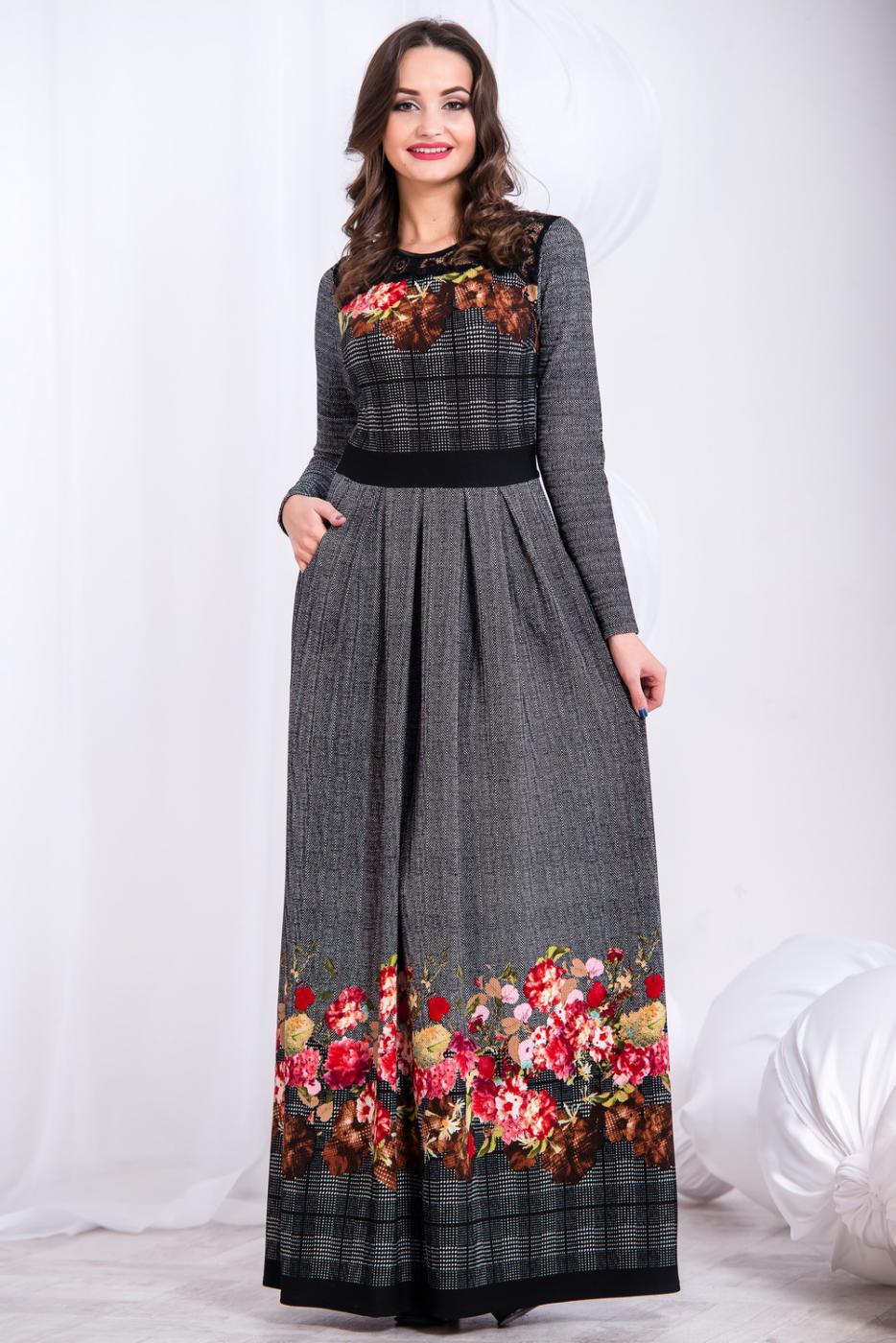 Длинное теплое платье с полупрозрачной гипюровой кокеткой. Верх платья прилегающий, а юбка расширяется к низу благодаря складкам. Яркие цветочные мотивы украшают лиф и низ платья, вносят в образ нотку весны и женственности. В боковой шов вшита потайная застежка-молния. Также есть функциональные карманы.