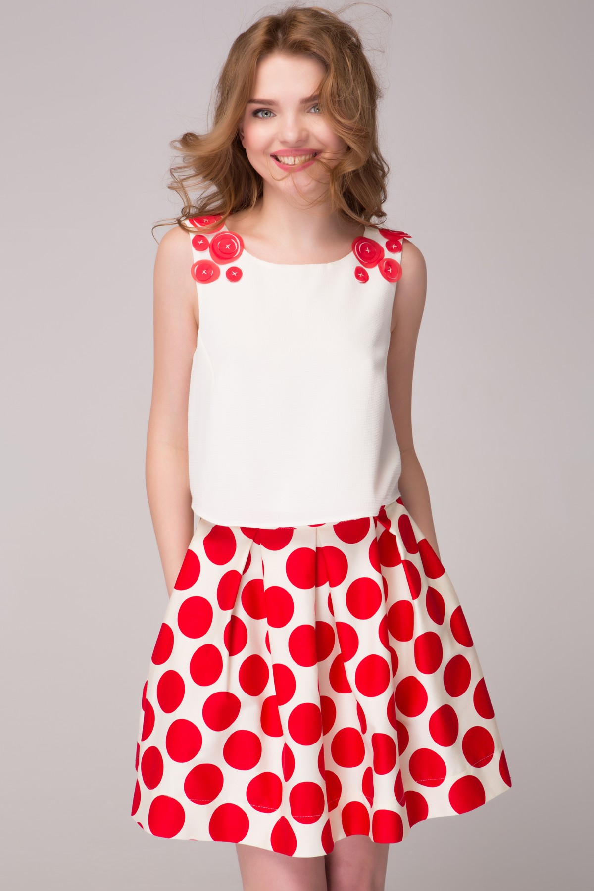 Стильный и нетривиальный костюм из комбинированных материалов: блуза - из креп-шифона, юбка - из коттона с эластаном. Костюм состоит из блузы свободного силуэта и короткой расширенной юбки с глубокими складами. Блуза с круглым вырезом горловины, с нагрудными вытачками, без застежек; на подкладке. Широкие бретели блузы украшены оригинальным декором в виде шифоновых кругов разного размера, цвет декора повторяет цвет принта на юбке. Юбка с притачным поясом, со средним швом, с застежкой на тесьму «молния» и две металлические кнопки по центру спинки; с карманами в боковых швах. Этот игривый летний костюм покорит сердце любой модницы.