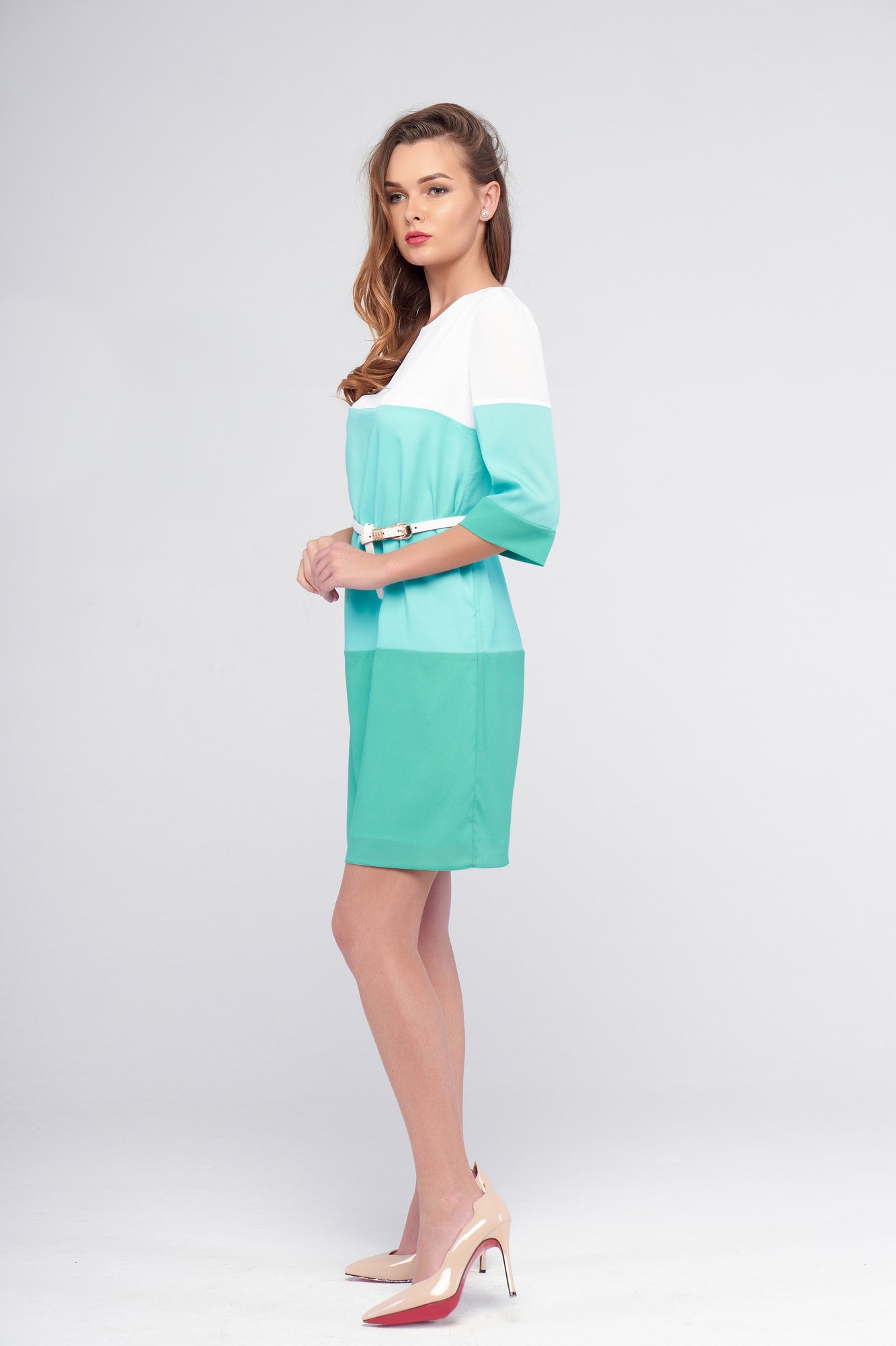 Комфортное повседневное платье, комбинированное тремя цветами креп-шифона. Прямого силуэта, длиной выше колена, с рукавом 3/4; без застежек; на подкладке. Перед и спинка представляют собой сочетание трех цветов - молочного и двух ярких. Использование таких цветовых блоков позволяет отнести платье к актуальному стилю "color blocking" - яркому, позитивному и насыщенному интересными сочетаниями оттенков. Подкладка выполнена из креп-шифона молочного цвета, благодаря ей платье не просвечивается; подкладка зафиксирована и не "поднимается" при ходьбе. Рукава втачные, длиной 3/4, комбинированы двумя цветами креп-шифона, манжеты в тон нижнего цвета платья. Платье укомплектовано стильным ремешком, позволяющим сделать акцент на талии.
