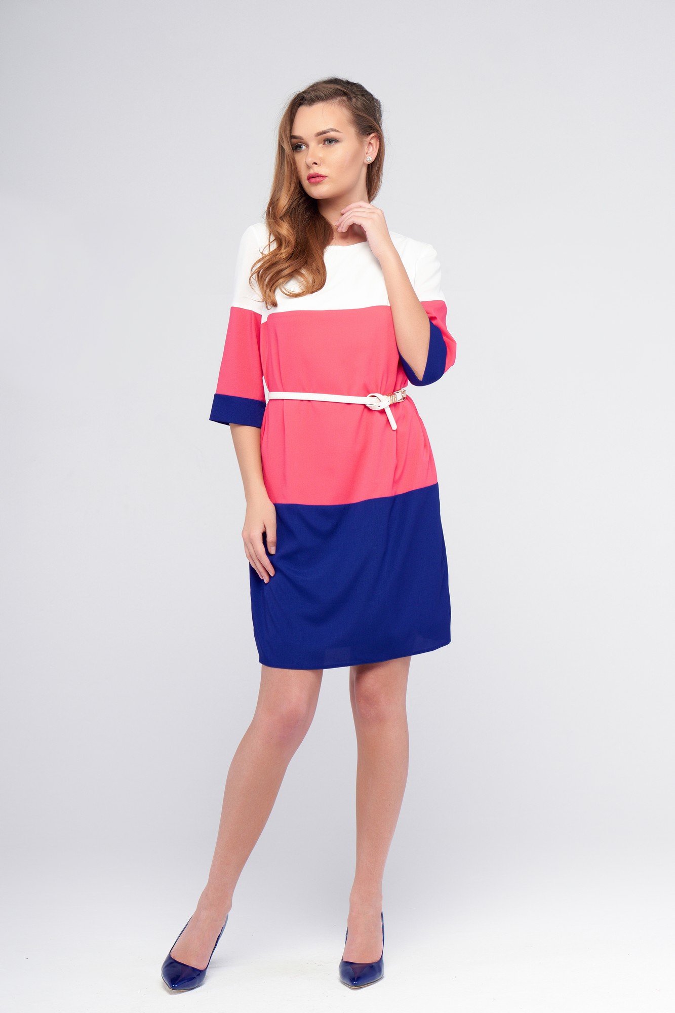 Комфортное повседневное платье, комбинированное тремя цветами креп-шифона. Прямого силуэта, длиной выше колена, с рукавом 3/4; без застежек; на подкладке. Перед и спинка представляют собой сочетание трех цветов - молочного и двух ярких. Использование таких цветовых блоков позволяет отнести платье к актуальному стилю "color blocking" - яркому, позитивному и насыщенному интересными сочетаниями оттенков. Подкладка выполнена из креп-шифона молочного цвета, благодаря ей платье не просвечивается; подкладка зафиксирована и не "поднимается" при ходьбе. Рукава втачные, длиной 3/4, комбинированы двумя цветами креп-шифона, манжеты в тон нижнего цвета платья. Платье укомплектовано стильным ремешком, позволяющим сделать акцент на талии.