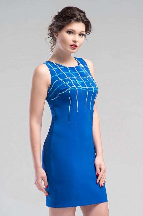 Женственное и элегантное платье из костюмной ткани(bi-stretch). Платье прилегающего силуэта, без рукава, длиной выше колена. Потайная застежка «молния» находится в левом боковом шве. Перед с круглым вырезом горловины, с нагрудными выходящими из бока вытачками, которые продолжаются до талии, что делает фигуру более стройной, подчеркивая ее преимущества. Спинка с фигурными рельефами, которые образуют безукоризненное прилегание по фигуре. Отдельно стоит отметить декор платья - это оригинальная вышивка в виде волнистых линий, образующих принт "клетка"; вышивка выполнена яркими нитями, прекрасно сочетающимися с основным цветом платья. Такой декор делает платье более изысканным и эффектным. Девушки, помните, красивое платье – залог Вашего успеха!