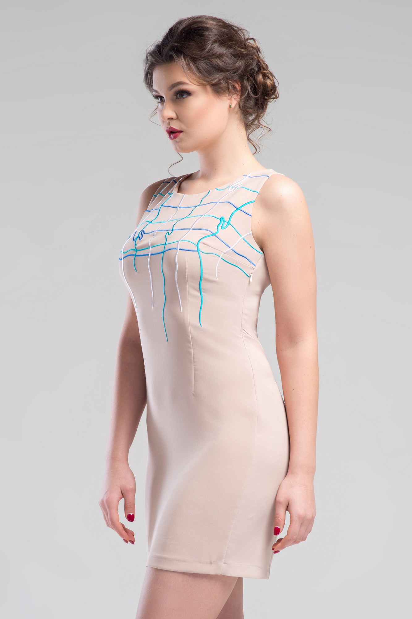 Женственное и элегантное платье из костюмной ткани(bi-stretch). Платье прилегающего силуэта, без рукава, длиной выше колена. Потайная застежка «молния» находится в левом боковом шве. Перед с круглым вырезом горловины, с нагрудными выходящими из бока вытачками, которые продолжаются до талии, что делает фигуру более стройной, подчеркивая ее преимущества. Спинка с фигурными рельефами, которые образуют безукоризненное прилегание по фигуре. Отдельно стоит отметить декор платья - это оригинальная вышивка в виде волнистых линий, образующих принт "клетка"; вышивка выполнена яркими нитями, прекрасно сочетающимися с основным цветом платья. Такой декор делает платье более изысканным и эффектным. Девушки, помните, красивое платье – залог Вашего успеха!