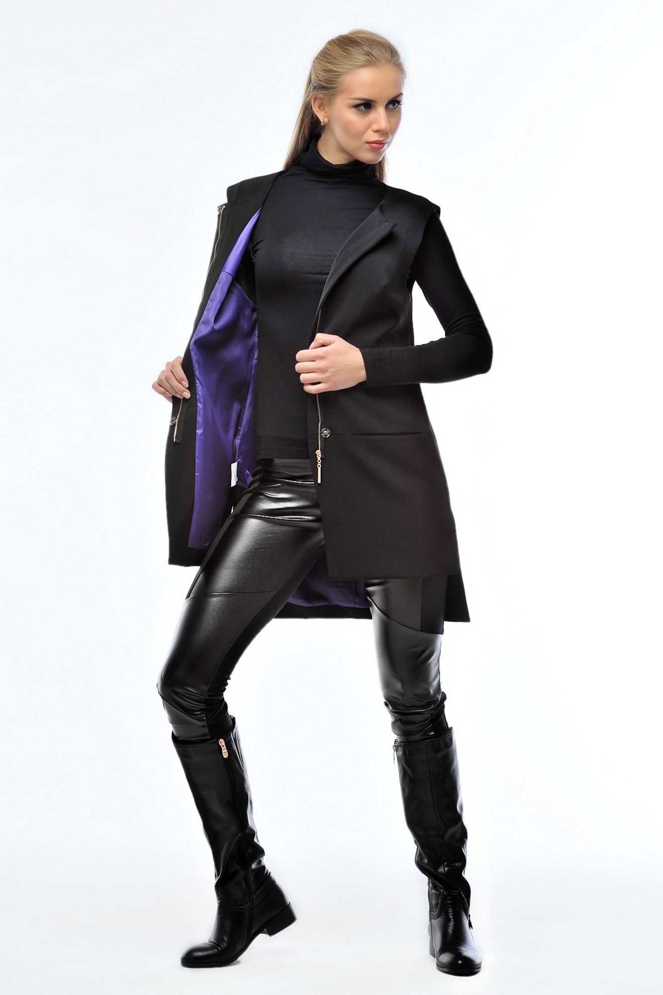 Жилет из костюмной ткани прямого силуэта, длиной ниже бедер. Изделие с подкладкой контрастного цвета.
