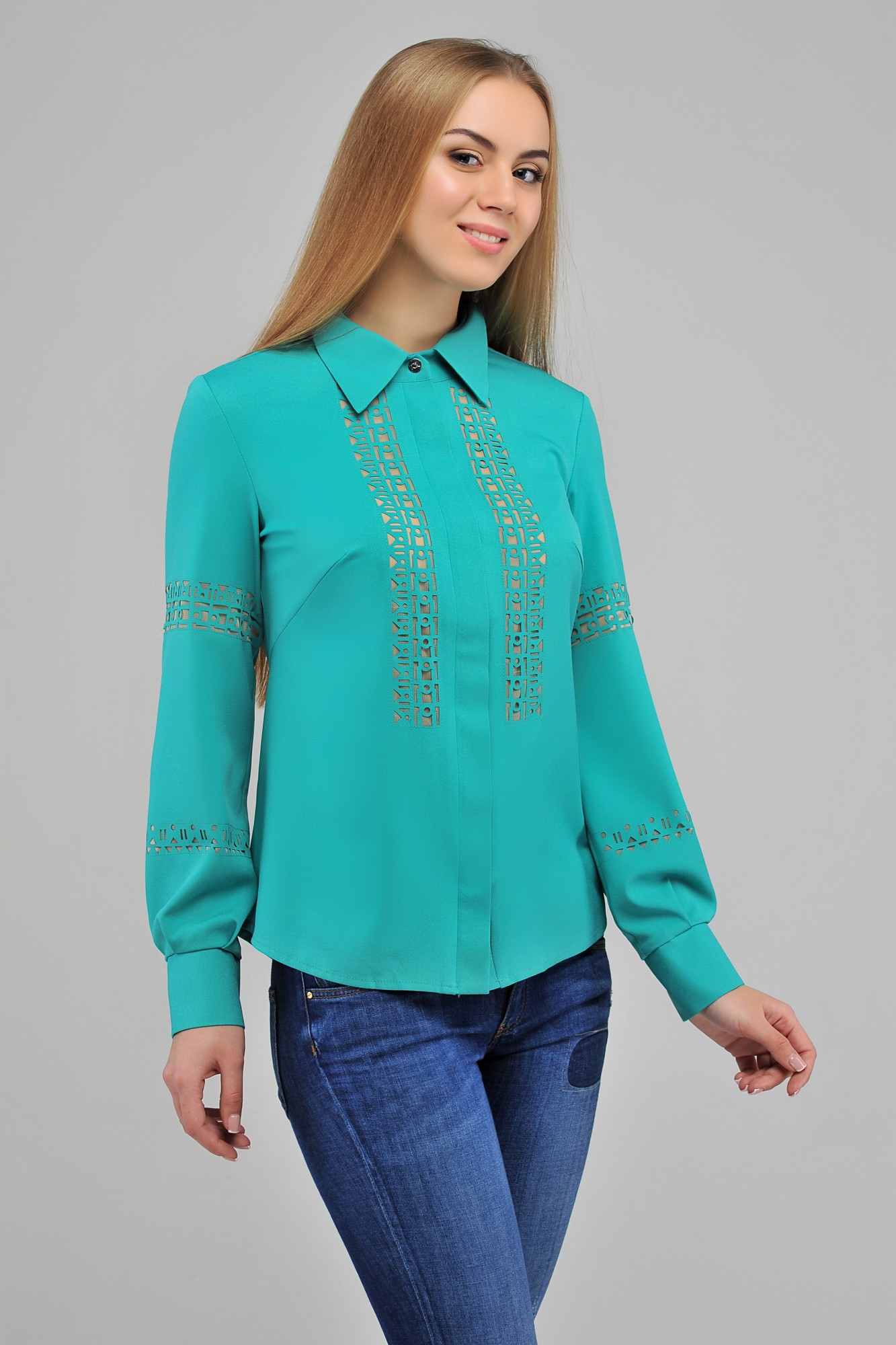 Перед состоит из двух полочек с центральной потайной застежкой на 7 кнопок, с нагрудными вытачками, выходящими из бокового шва. Спинка со средним швом и талиевыми вытачками. Рукава втачные с манжетами. Воротник рубашечный с отрезной стойкой. Полочки, рукава декорированы ажурной перфорацией , укрепленной мелкой сеткой.
