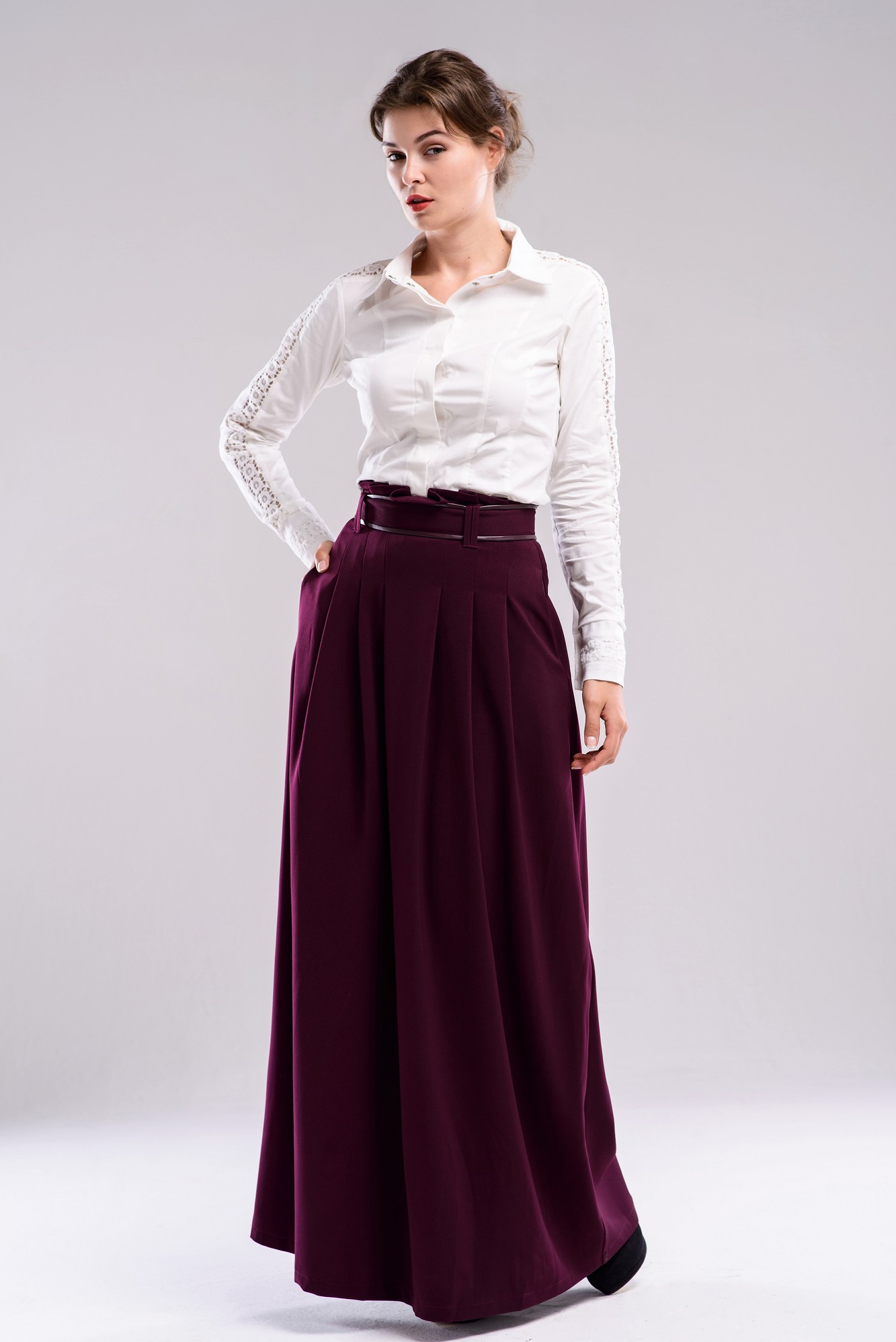Повседневно-нарядная юбка в пол из костюмной ткани, с односторонними складами и поясом на талии.