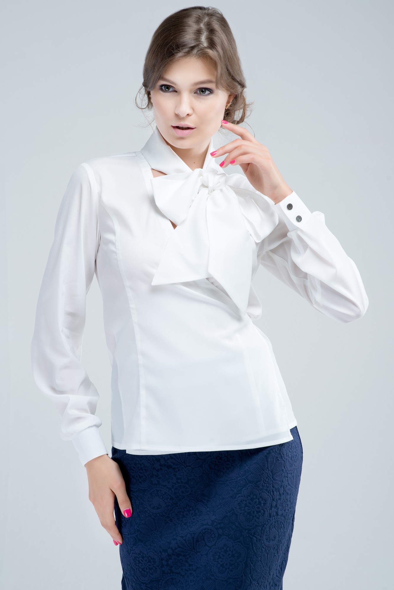 Нарядно-повседневная блуза из плотного креп-шифона. Полуприлегающего силуэта запах, втачной длинный рукав с манжетом, стойка воротник с цельнокроеными завязками для банта или галстука.