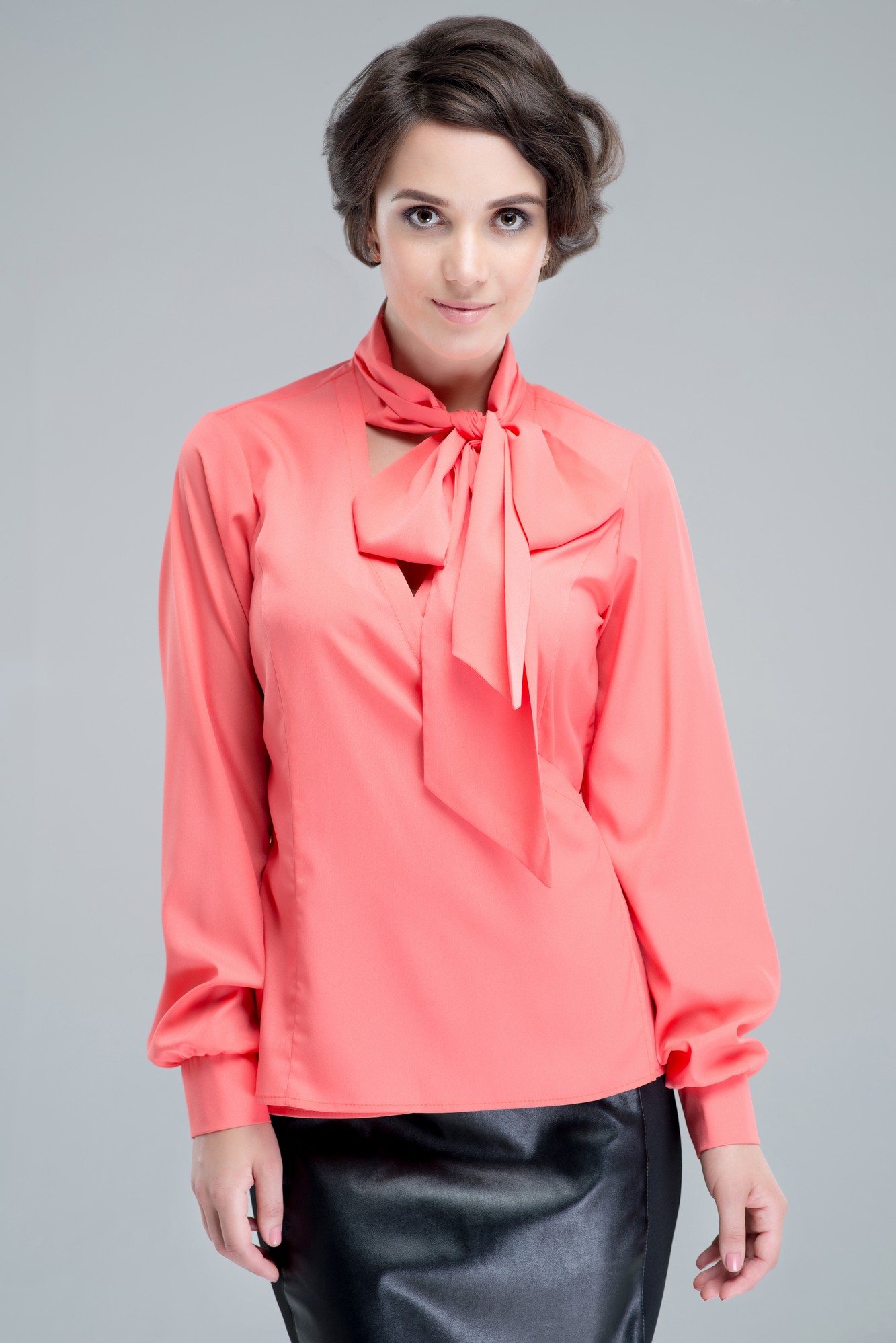 Нарядно-повседневная блуза из плотного креп-шифона. Полуприлегающего силуэта запах, втачной длинный рукав с манжетом, стойка воротник с цельнокроеными завязками для банта или галстука.
