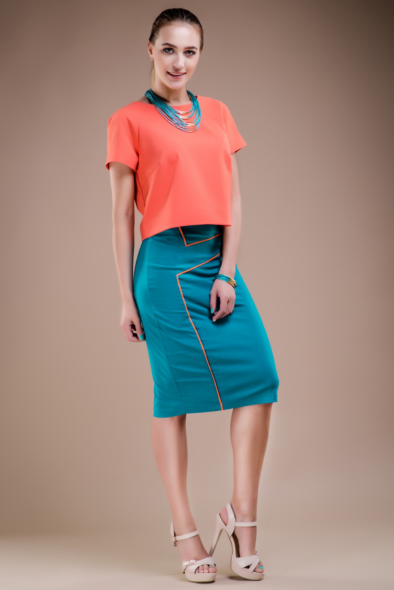 В фигурных линиях переда расположены контрастные канты. По центру спинки-тесьма-молния от талии и шлица по низу юбки. Верхний срез юбки обработан обтачкой.