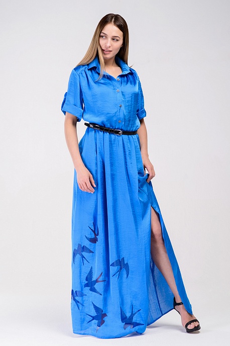 Универсальное платье-рубашка из струящейся тонкой ткани, длиной в пол, полуприлегающего силуэта, с отрезной юбкой по талии, с напуском по линии соединения с поясом. Съемный тонкий лаковый ремешок с металлической пряжкой, добавляет контрастный цвет к платью. Перед с притачной планкой, с застежкой на металлические пуговицы. Юбка расширенная к низу, с карманами в боковых швах, с эффектным разрезом демонстрирующим ножки при ходьбе. На подоле и на спине платья перфорация в виде ласточек из трикотажной сетки, этот элемент придает платью ощущение легкости. Рукава втачные длиной до локтя с манжетом. Хлястик, регулирует длину рукава. Воротник отрезной стойкой, что создает вид рубашки.
