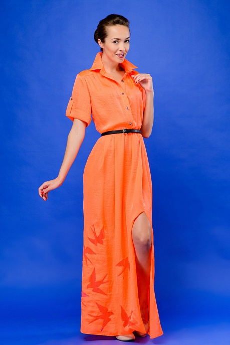 Универсальное платье-рубашка из струящейся тонкой ткани, длиной в пол, полуприлегающего силуэта, с отрезной юбкой по талии, с напуском по линии соединения с поясом. Съемный тонкий лаковый ремешок с металлической пряжкой, добавляет контрастный цвет к платью. Перед с притачной планкой, с застежкой на металлические пуговицы. Юбка расширенная к низу, с карманами в боковых швах, с эффектным разрезом демонстрирующим ножки при ходьбе. На подоле и на спине платья перфорация в виде ласточек из трикотажной сетки, этот элемент придает платью ощущение легкости. Рукава втачные длиной до локтя с манжетом. Хлястик, регулирует длину рукава. Воротник отрезной стойкой, что создает вид рубашки.