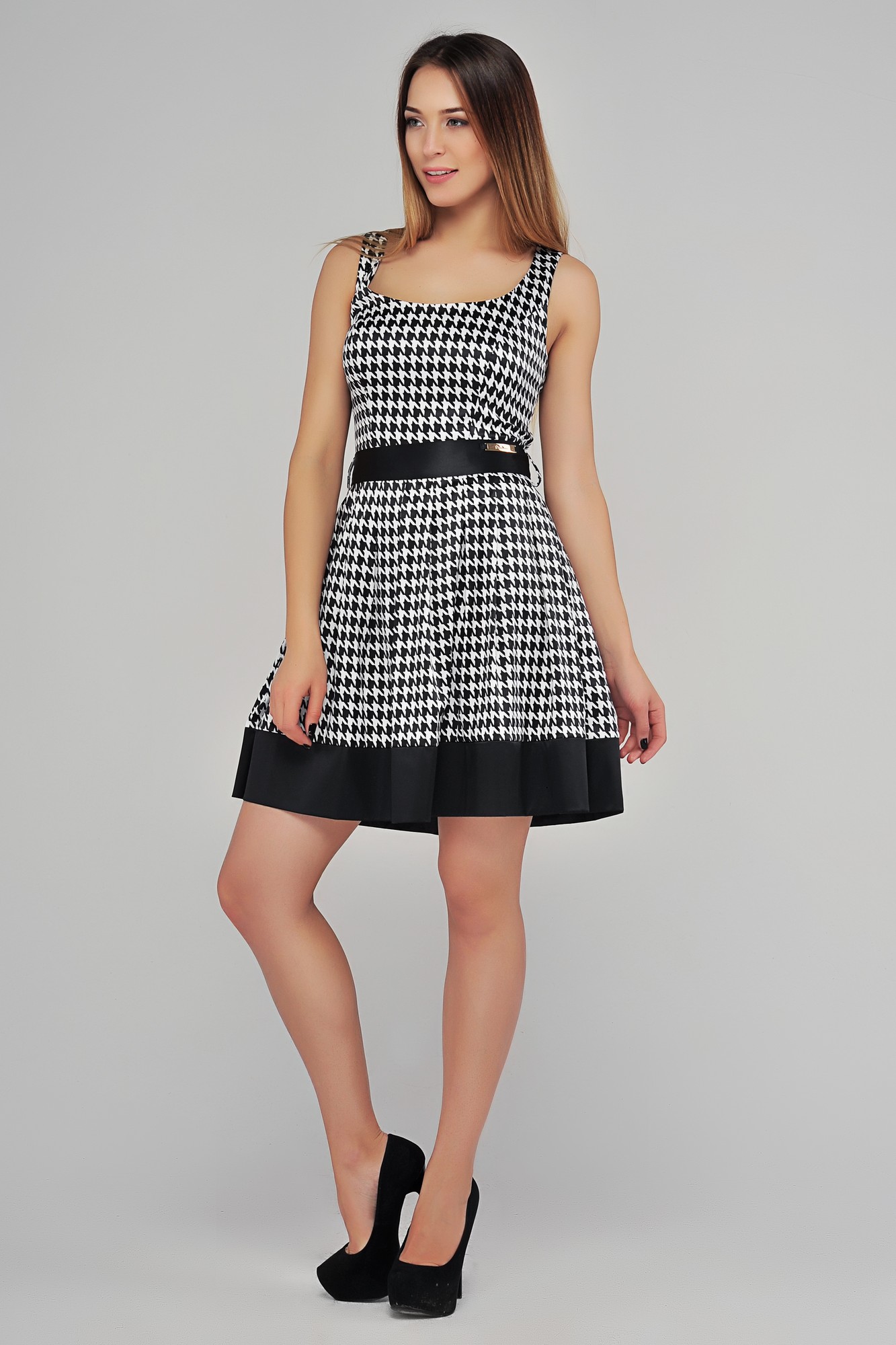 Короткое платье из котонового трикотажа с пышной юбкой, придает образу романтичный вид. Черно-белая расцветка позволяет сочетать его с обувью и аксессуарами различных оттенков. Шнуровка на спине позволяет регулировать посадку платья а также добавляет пикантную нотку в сдержанно-элегантный наряд. В этом платье можно отправиться на шопинг или на прогулку с друзьями. Дополнив его шалью или коротким пиджаком, наряд будет вполне уместным и в офисе.