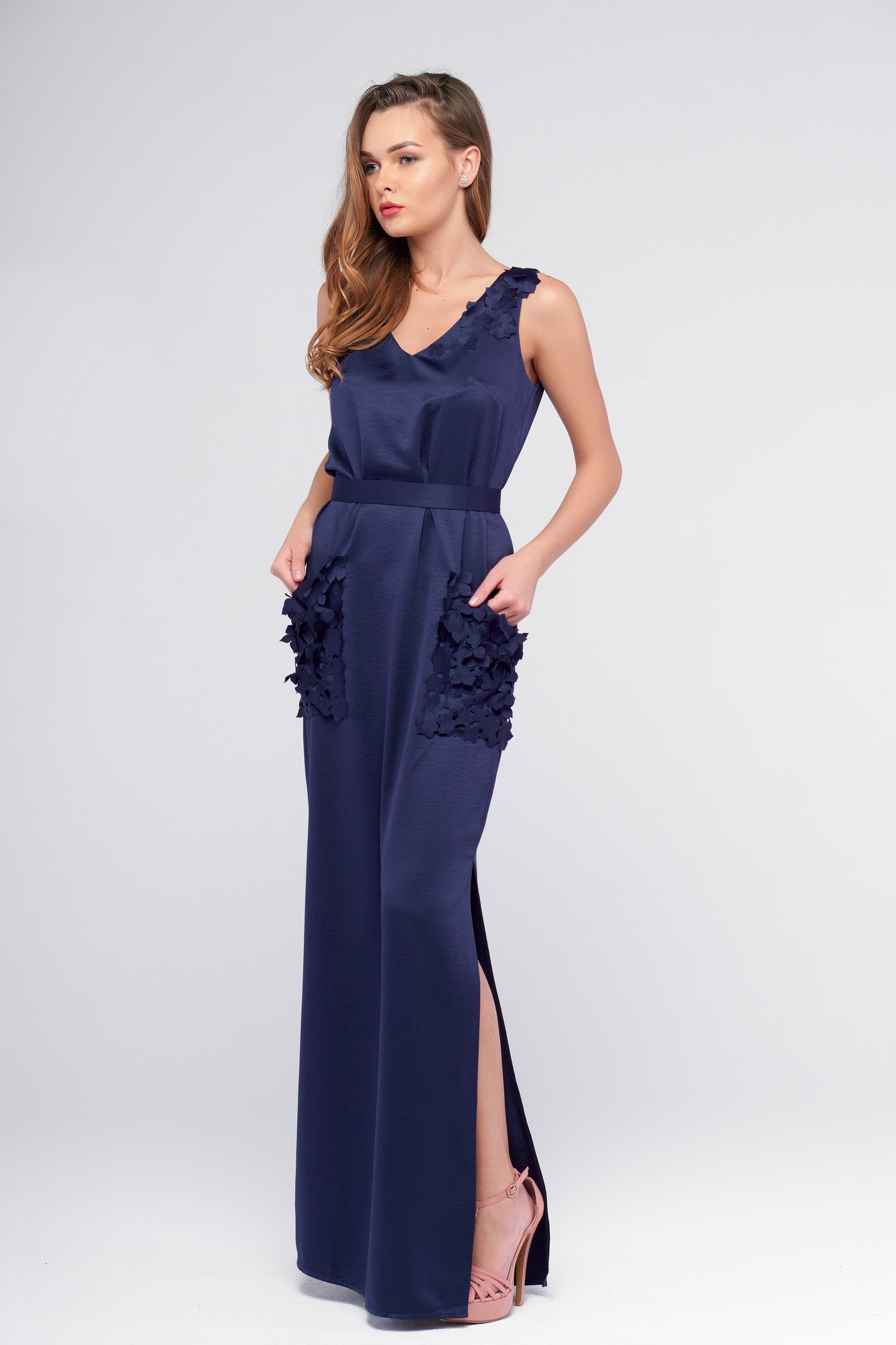 Стильное нарядное платье, выполненное из эколоджи - нежной тонкой ткани с приглушенным блеском. Платье прямого силуэта, длинное в пол, без застежек, со съемным поясом. Перед с глубоким V-образным вырезом горловины; с нагрудными вытачками, с карманами, украшенными потрясающим декором в виде цветов из основной ткани. Левая бретель также украшена декором. Цветы имеют разный размер и нашиты в несколько слоев, благодаря чему декор выглядит объемно и нетривиально. Спинка с овальным вырезом горловины. В боковых швах расположены разрезы чуть выше уровня колен. Съёмный пояс из основной ткани в тон платья, на пришивных кнопках. Это платье обречено быть любимым и востребованным.