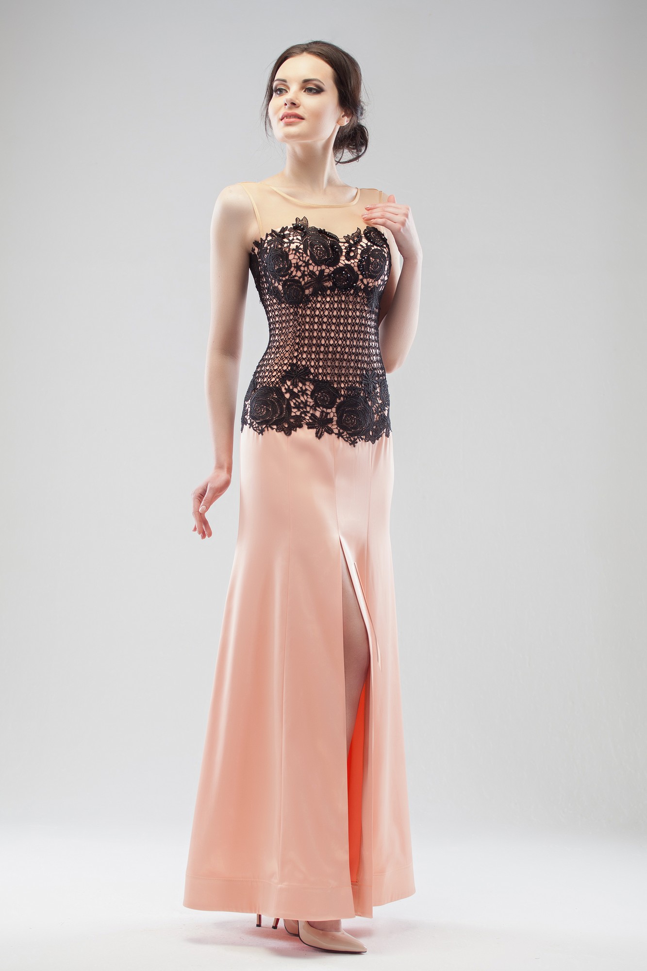 Платье вечернее корсетного типа из однотонного атласа итальянского производства, накрытого в области талии крупной черной сеткой, длинное в пол, прилегающего силуэта с годеобразным расширением к низу, отрезное по линии бедер, с застежкой на потайную тесьму «молния» в левом боковом шве.